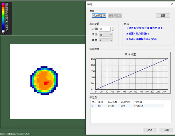 薄膜压力传感器内部材料为压敏电阻,通过采集器输出到软件的原始值为A/D(模拟量转数字量)转换后的数值,其数值没有实际物理意义,必须经过标定步骤,赋予这些数值实际的物理意义,如压力值、压强值。